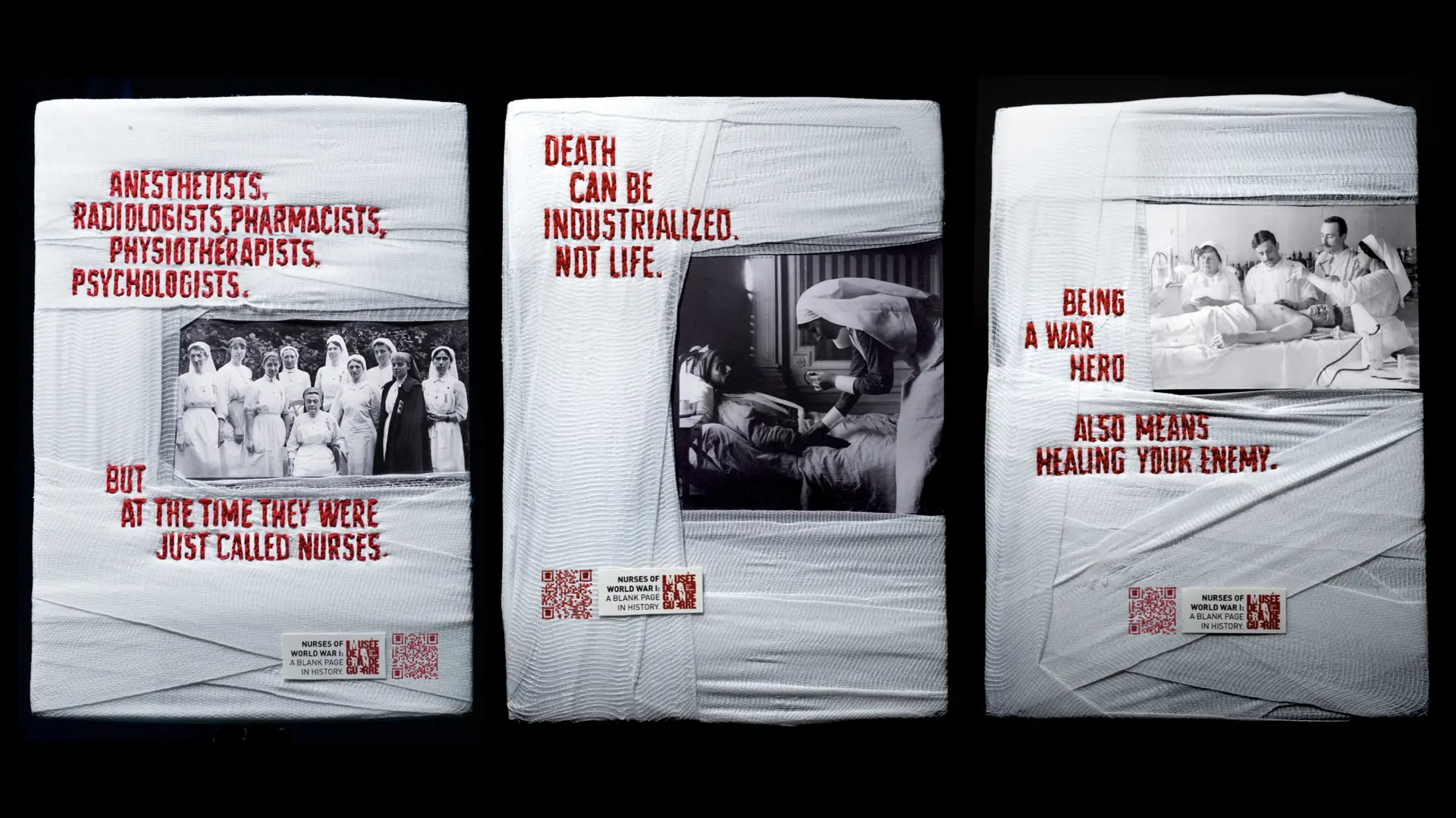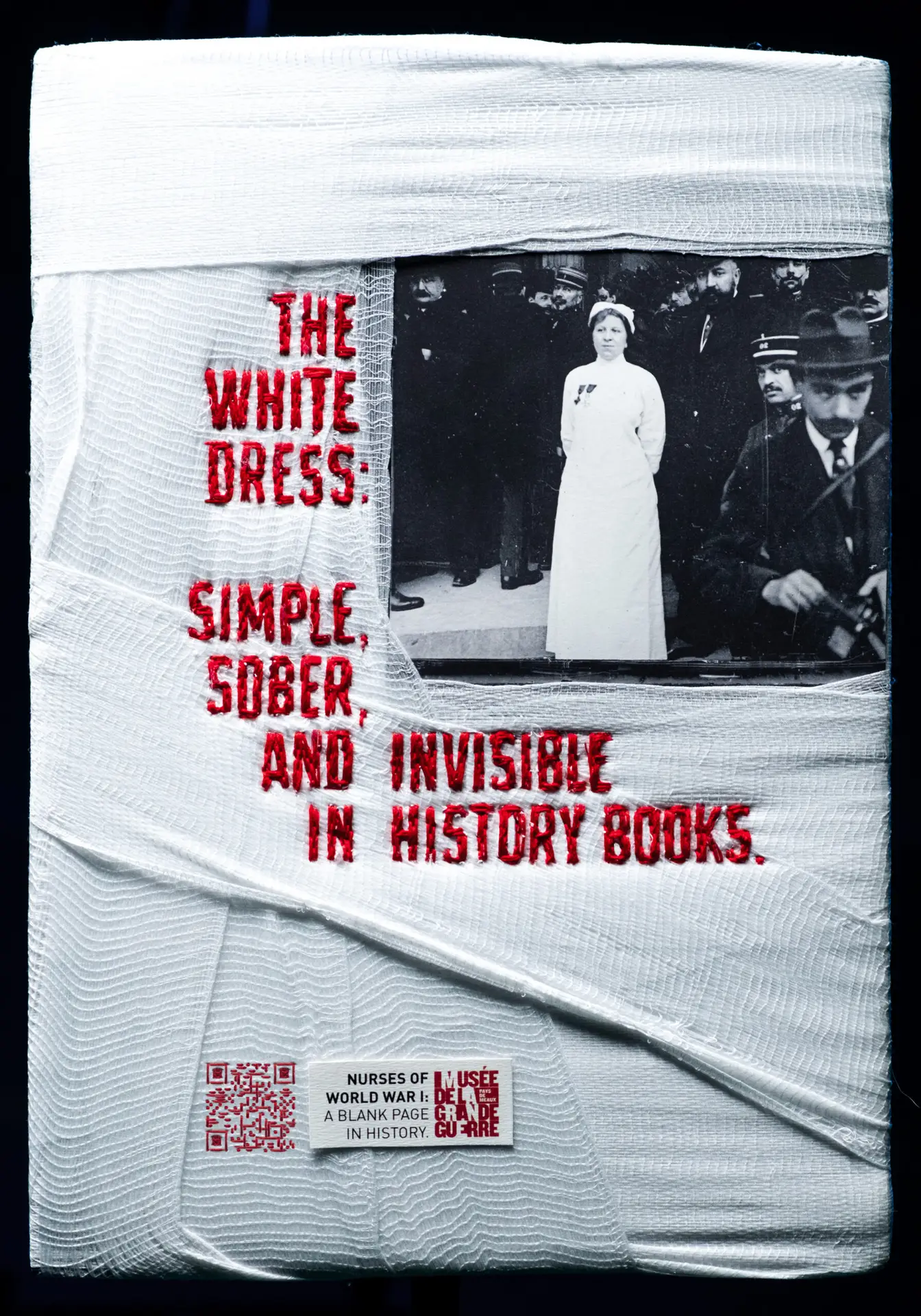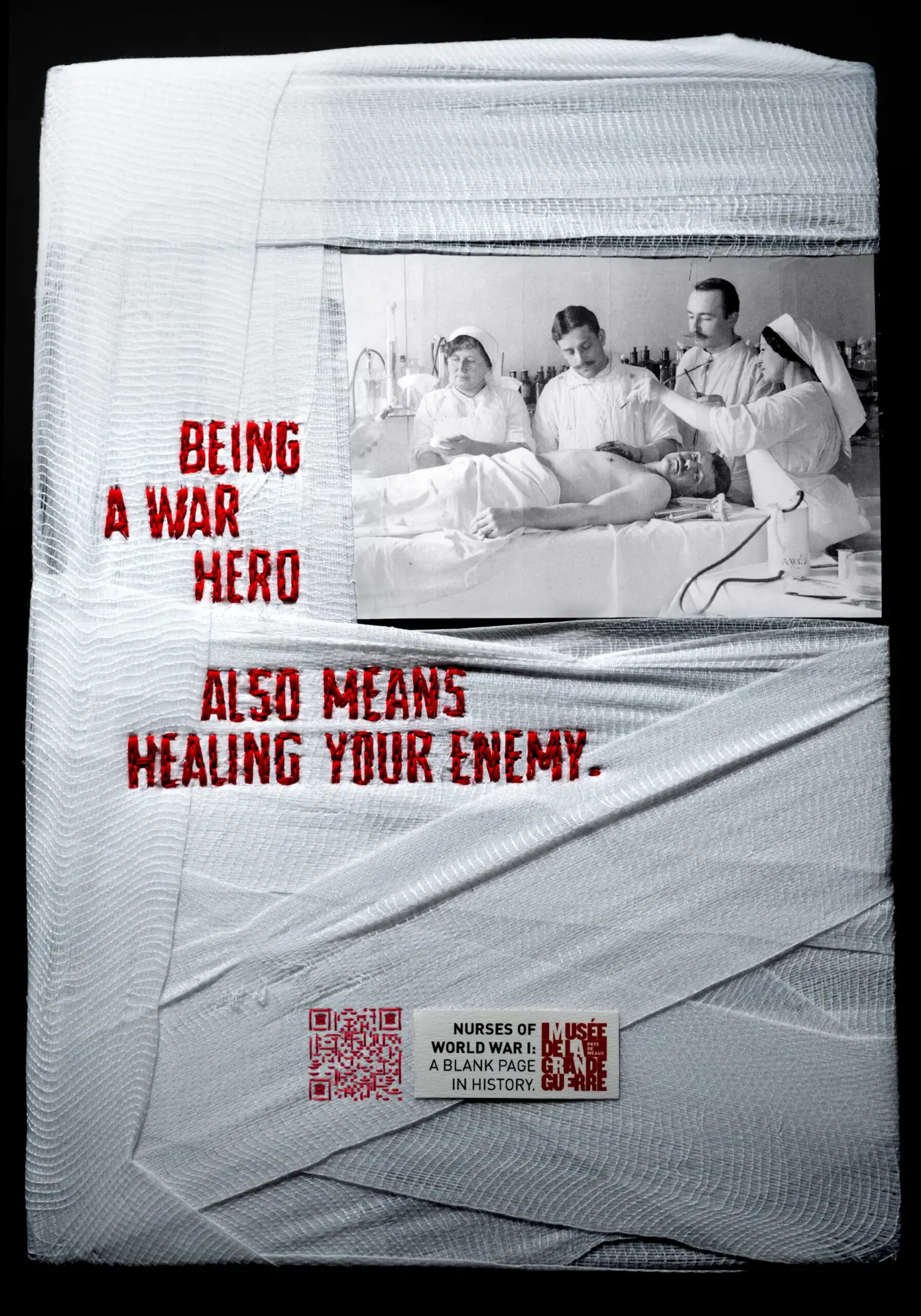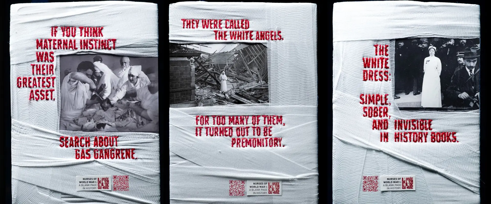 Using authentic photographic archives, the campaign visuals were physically reconstructed with bandages and thread, the very tools these nurses used during the war. Each image bears the visible marks of repair, turning craft into meaning.