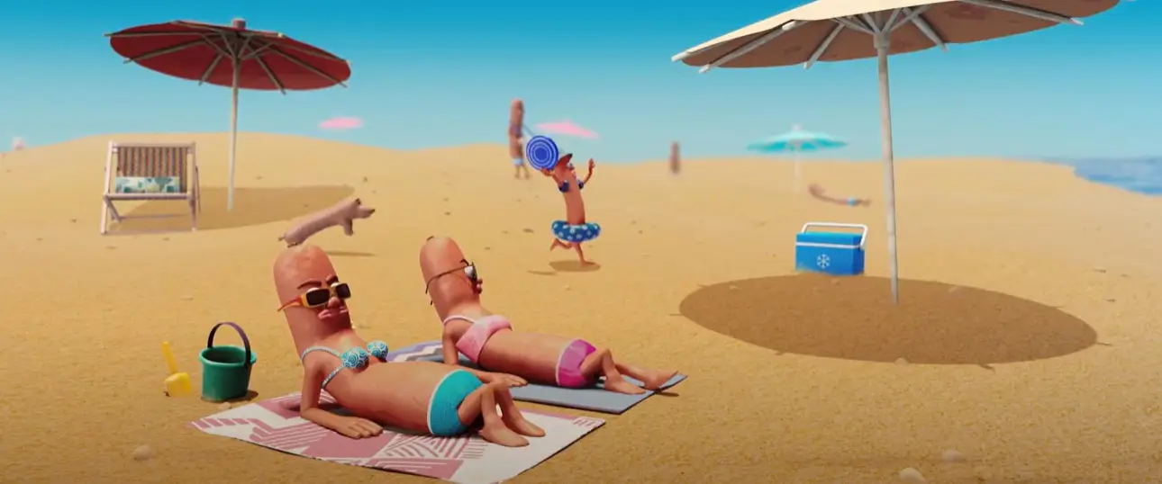 A 3D film shows sausages grilling without noticing the danger, while two friends on the beach casually talk about getting “nicely grilled.” It lands on a line you can’t miss: “We’re not sausages.”